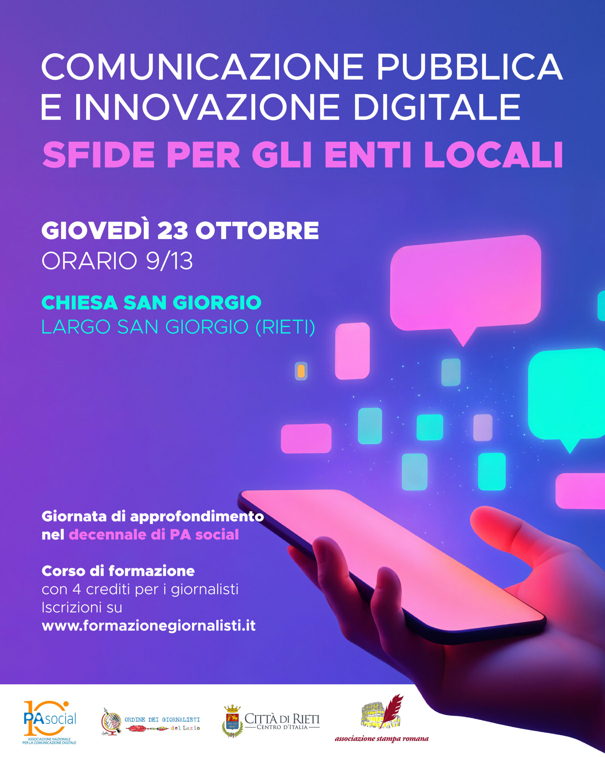 RIETI - Giovedì 23 ottobre 2025, dalle ore 9 alle ore 13, presso la Chiesa di San Giorgio (Largo San Giorgio) si terrà un incontro di approfondimento dal titolo “Innovazione digitale e comunicazione pubblica, sfide per gli Enti locali” promosso da PASocial in collaborazione con l’Ufficio Stampa del Comune di Rieti, l’Ordine dei Giornalisti del Lazio e l’Associazione Stampa Romana.